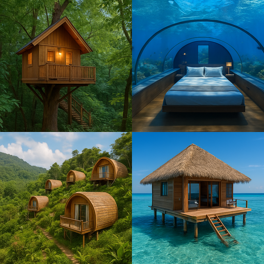 Podróże można uczynić niezapomnianymi nie tylko dzięki odwiedzanym miejscom, lecz również dzięki wyborowi **unikalnych** miejsc noclegowych. Zamiast standardowych hoteli coraz więcej turystów poszukuje **ekstremalnych**, **luksusowych** czy tematycznych obiektów, które wnoszą element **przygody** do codziennego pobytu. Od wiszących na drzewach sypialni, przez pływające chatki na wodzie, aż po podwodne pawilony – świat gościnności śmiało przekracza granice wyobraźni.